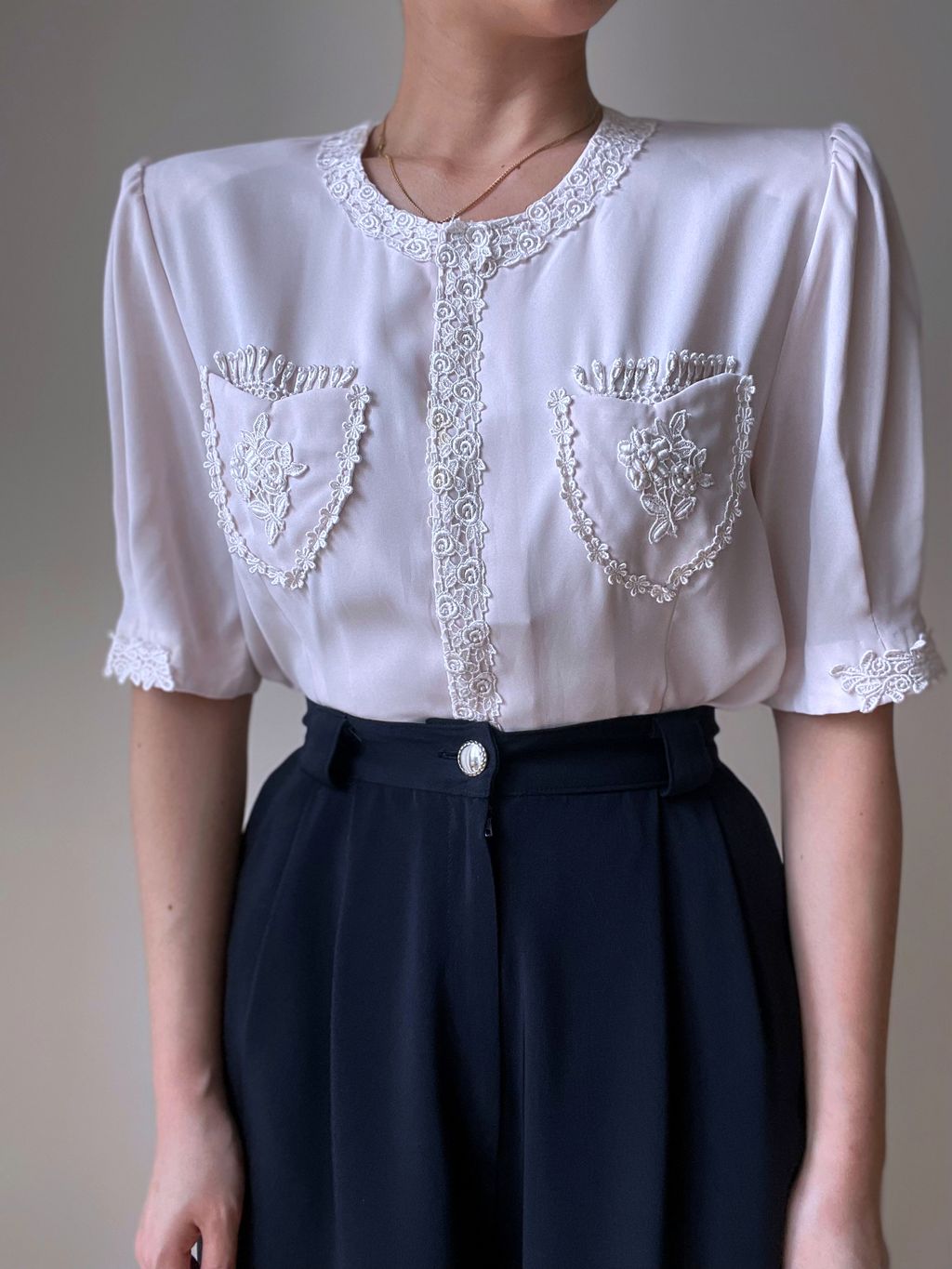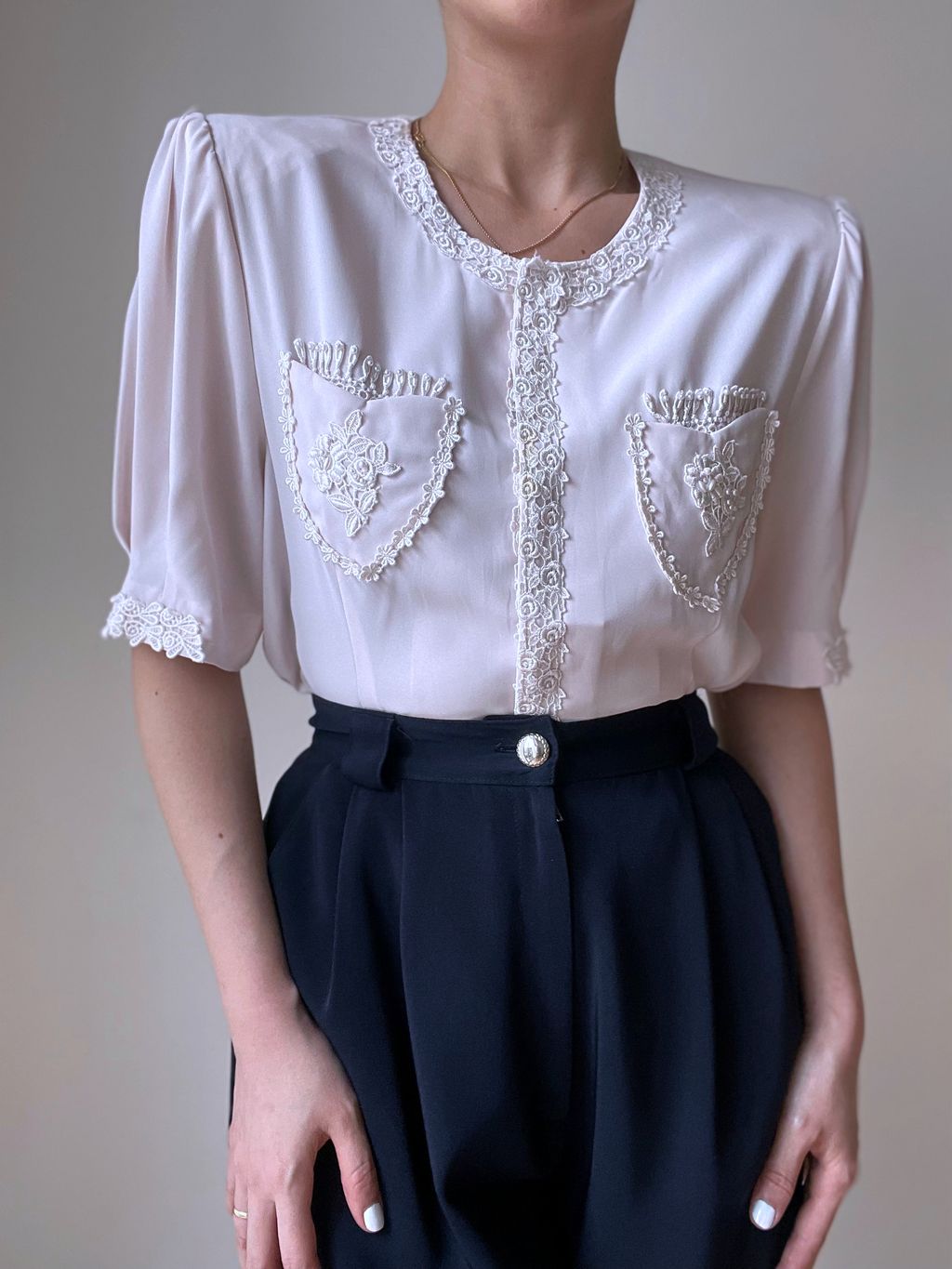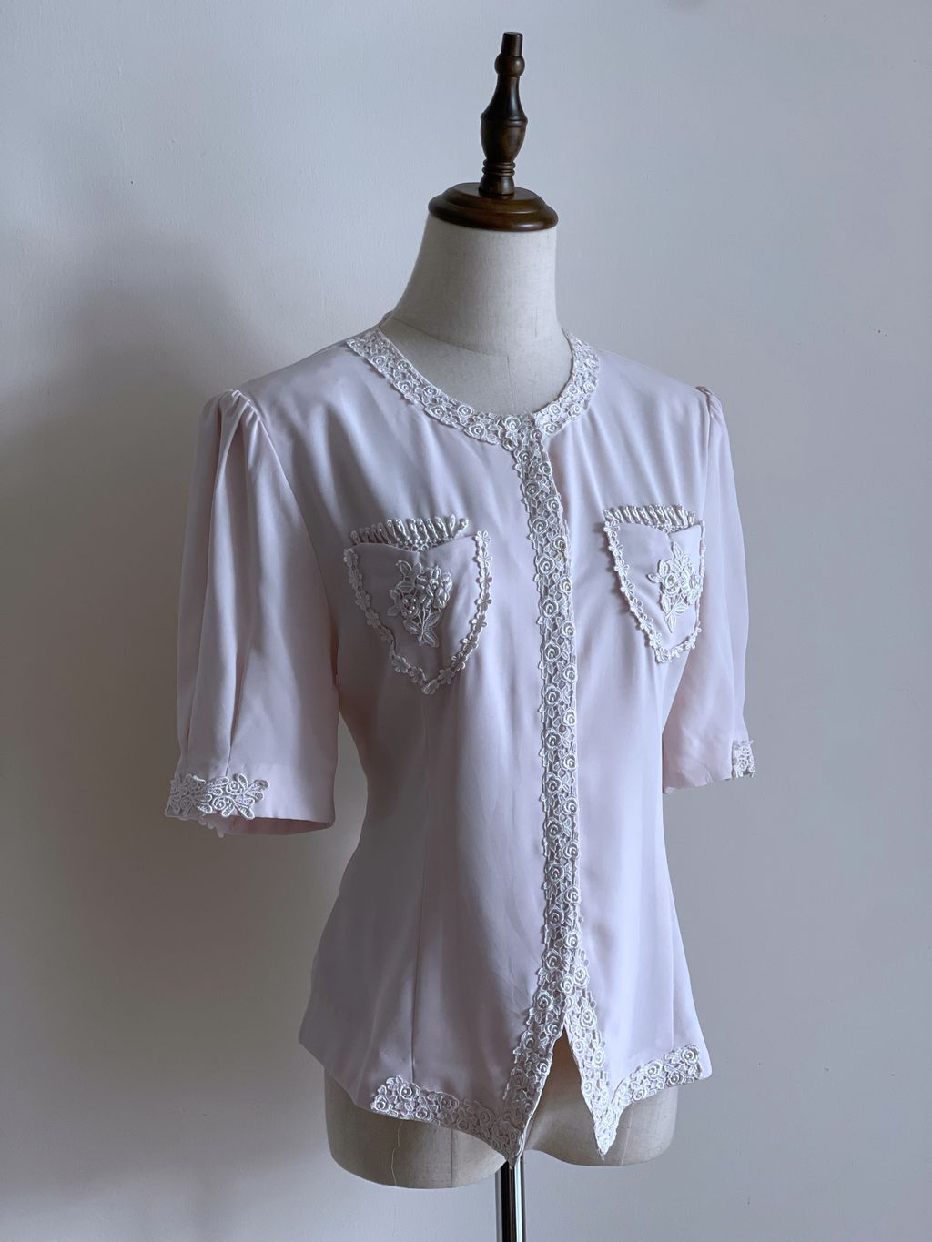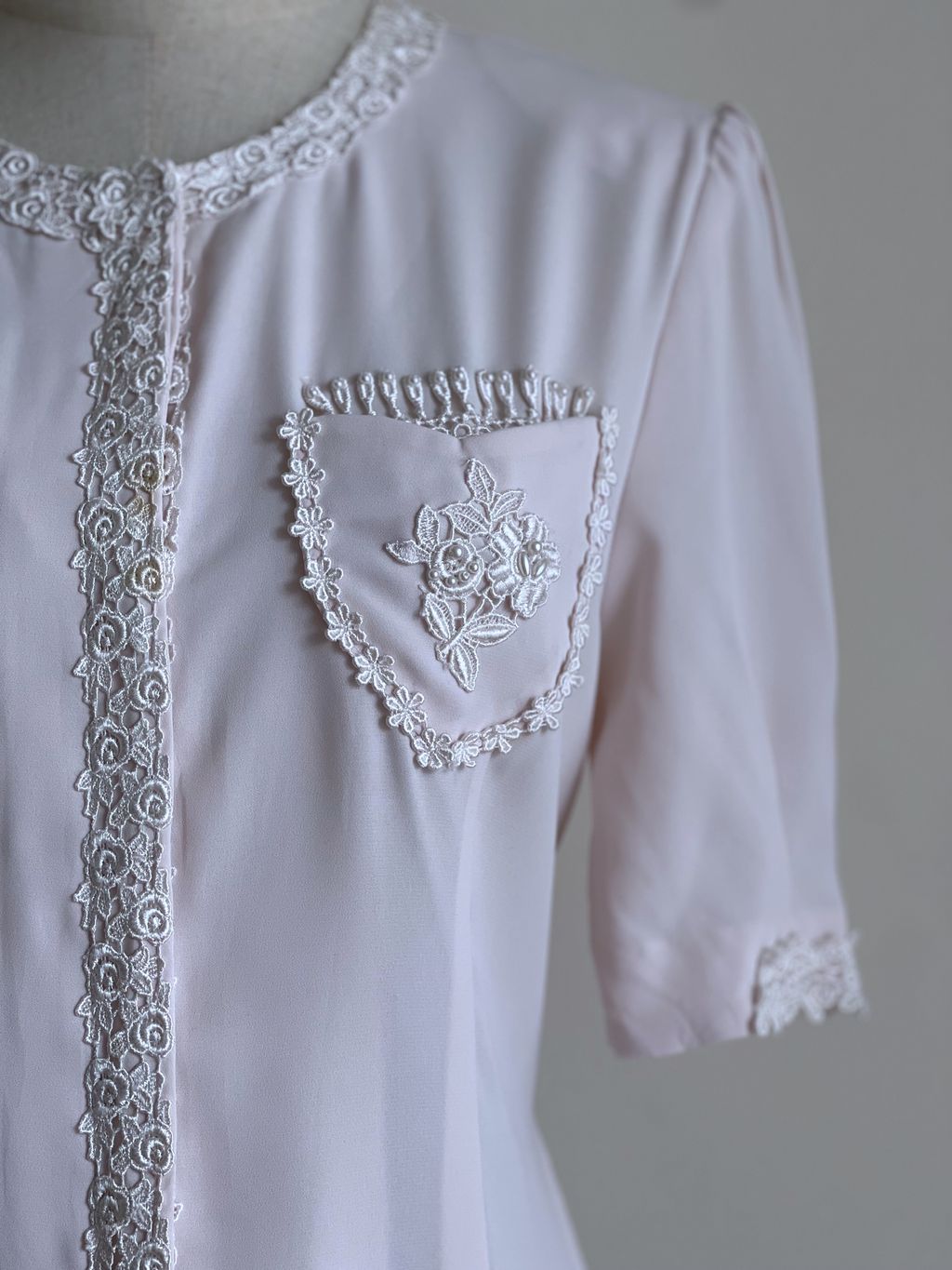 Vintage embellished pearl lace blouse / pastel baby pink / no lining / functional heart shaped pockets / handsewn pearl beads