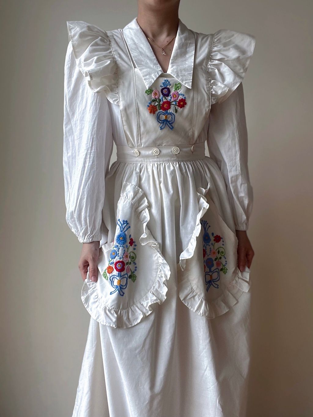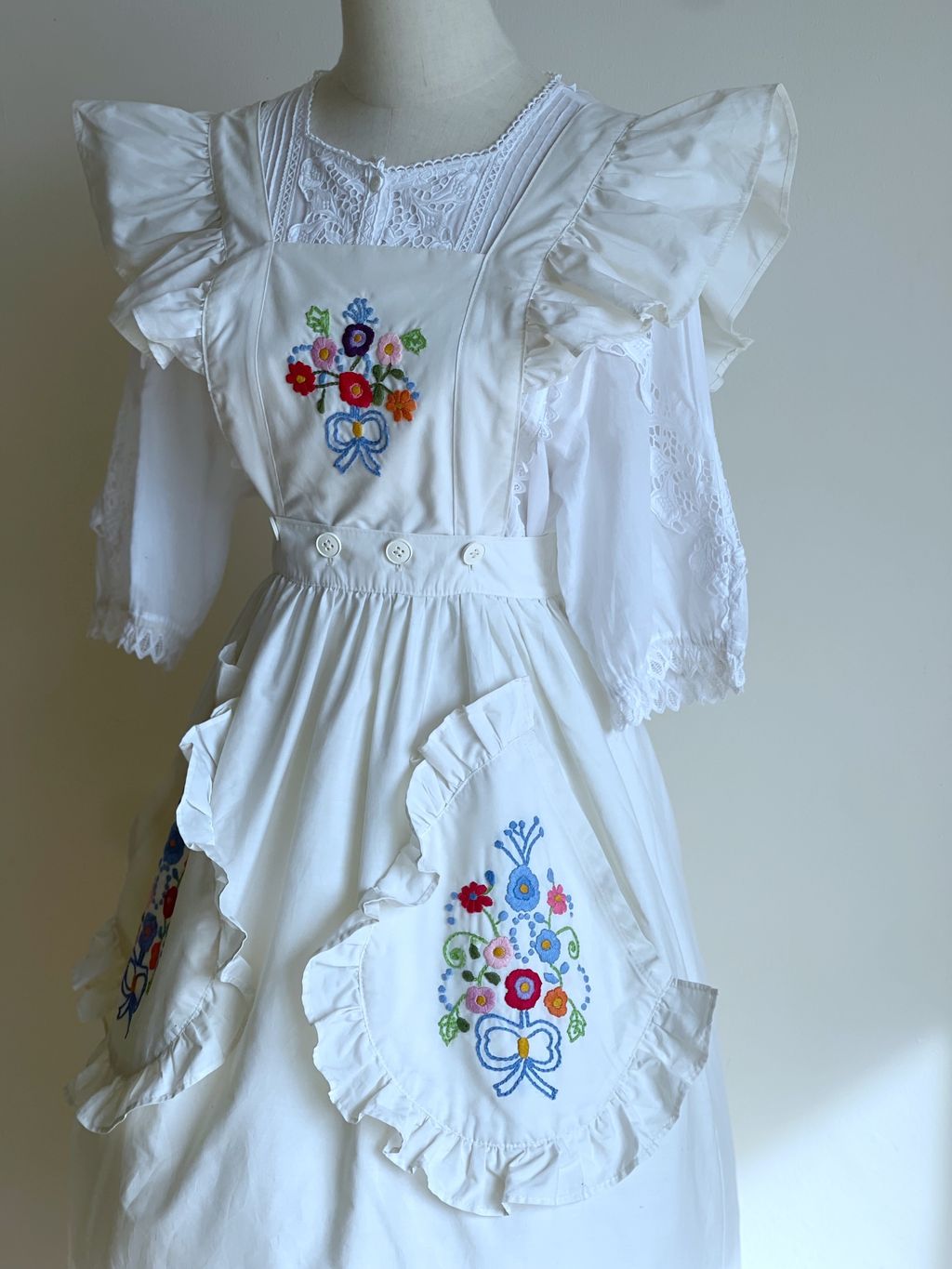 Absolutely darling vintage ruffled cotton jumper dress adorned with floral embroidery & two side pockets. Such a special piece that the apron can be detached from the top.