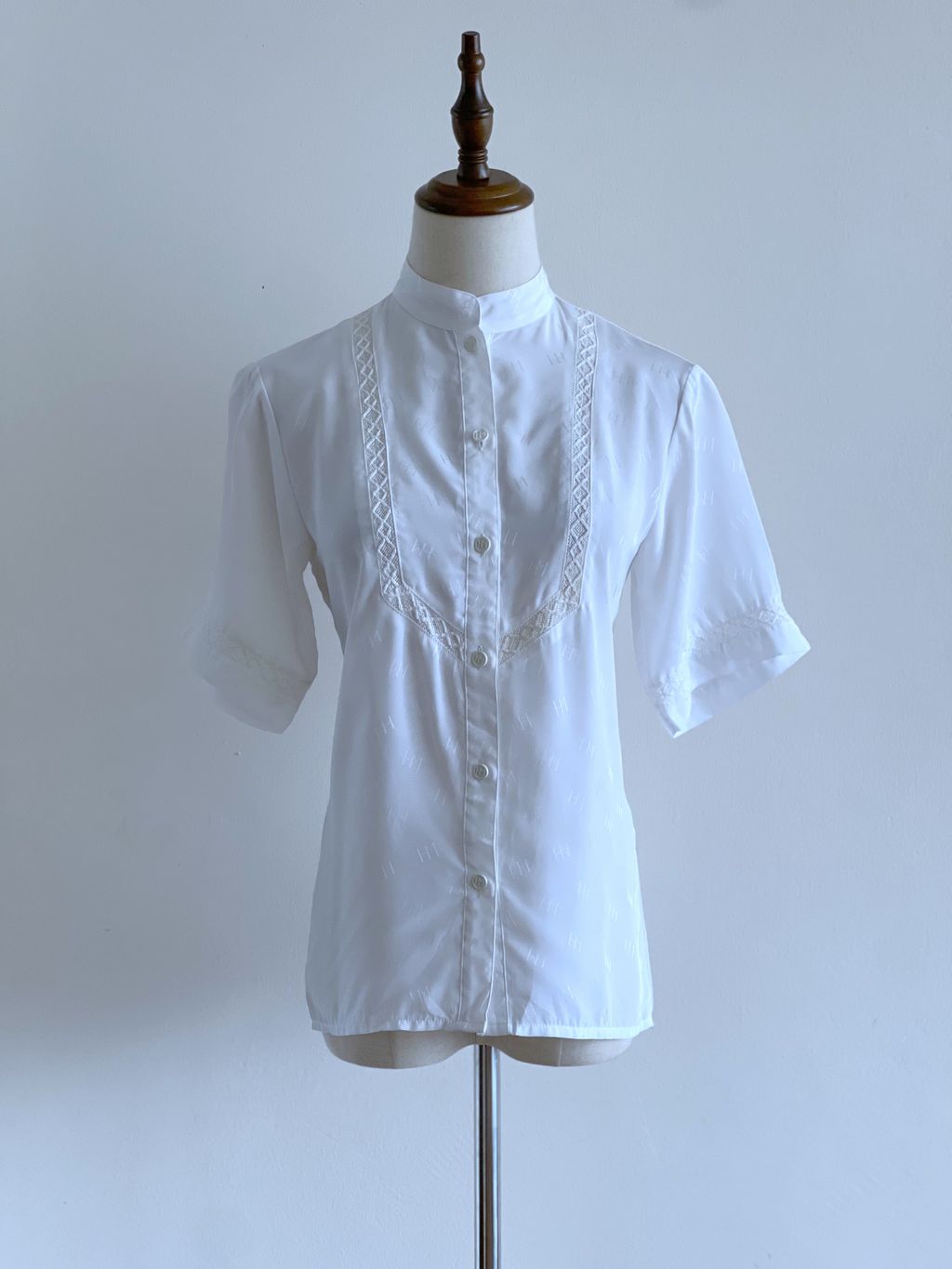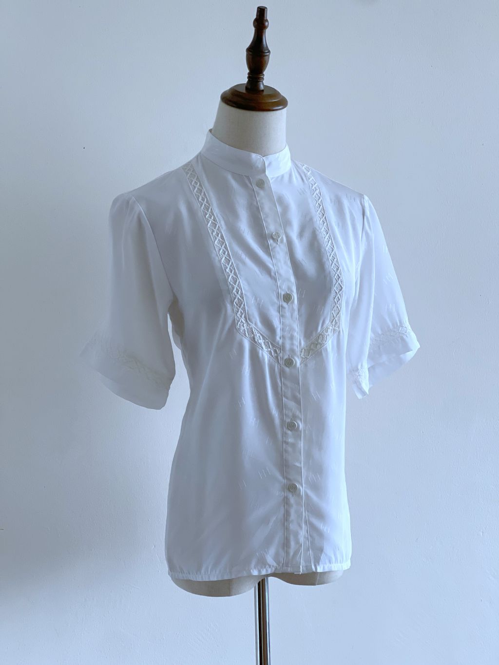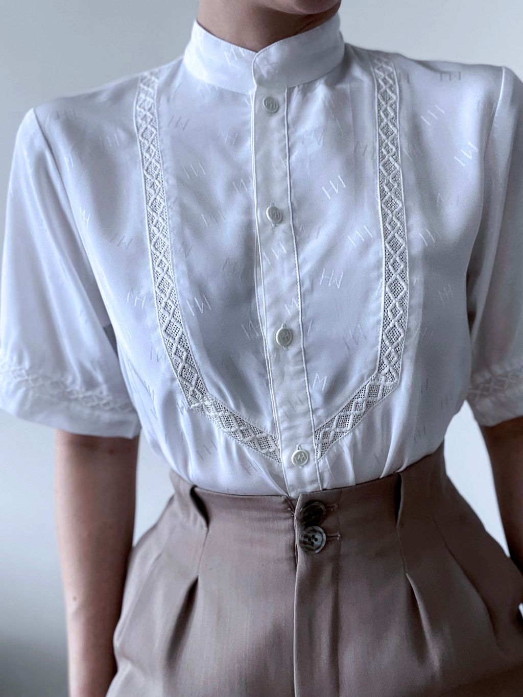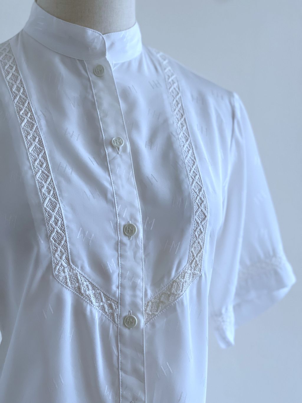 A refined vintage Hanae Mori blouse, distinguished by its short band collar and elegant upright silhouette that frames the neckline without a fold-over lapel. The front placket is adorned with decorative trim and fastened by a row of signature HM logo buttons, a subtle yet iconic hallmark of the house. Understated yet richly detailed, this piece embodies Hanae Mori’s timeless fusion of modern simplicity and delicate ornamentation—an exquisite addition for collectors of Japanese couture heritage.