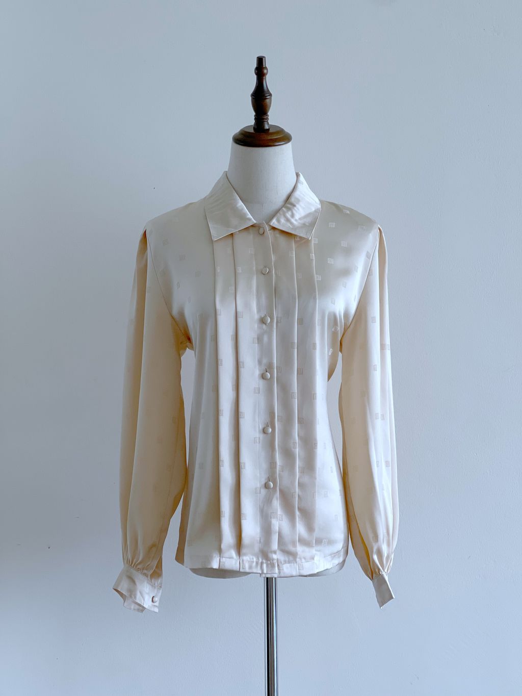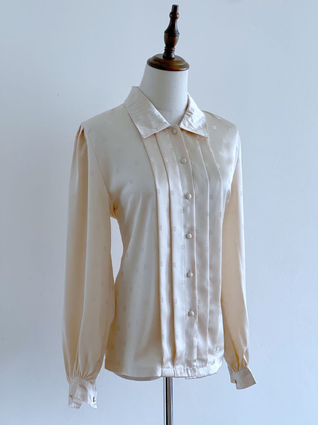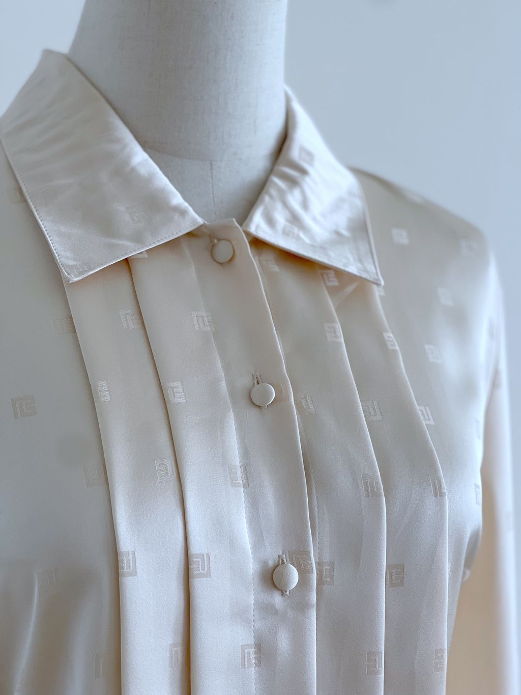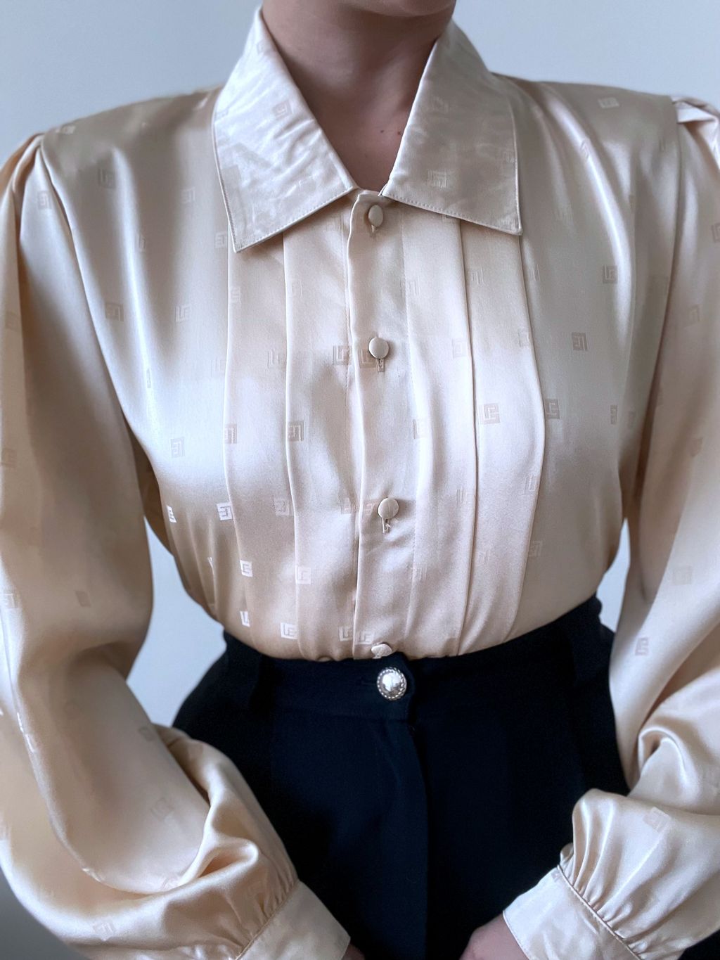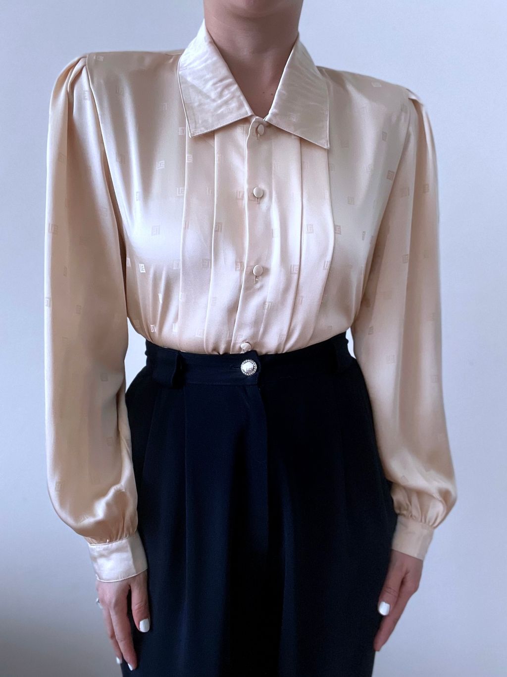 Effortlessly refined, this vintage Pierre Balmain Paris blouse captures the polished glamour of the 1980s. Cut from lustrous champagne-toned satin, the fabric shimmers softly with every movement, adorned throughout with the subtle Pierre Balmain monogram. Sharp front pleats lend tailored structure, balanced by a classic pointed collar and softly gathered cuffs. Pearlescent buttons add a touch of quiet luxury, while shoulder pads create a poised, confident silhouette. A timeless designer piece with enduring elegance.