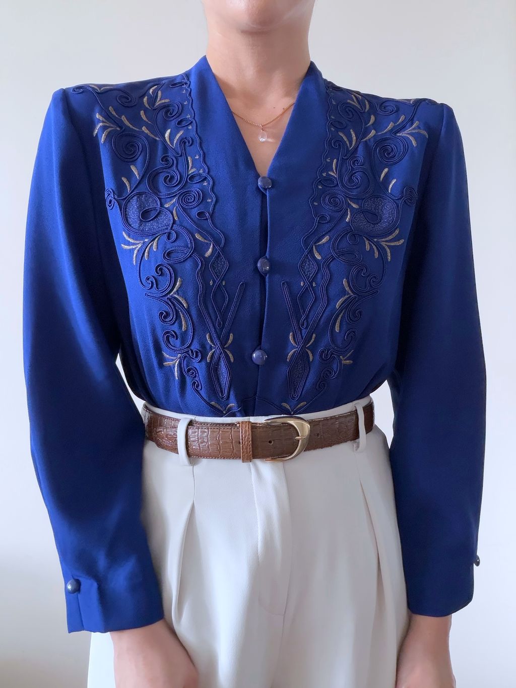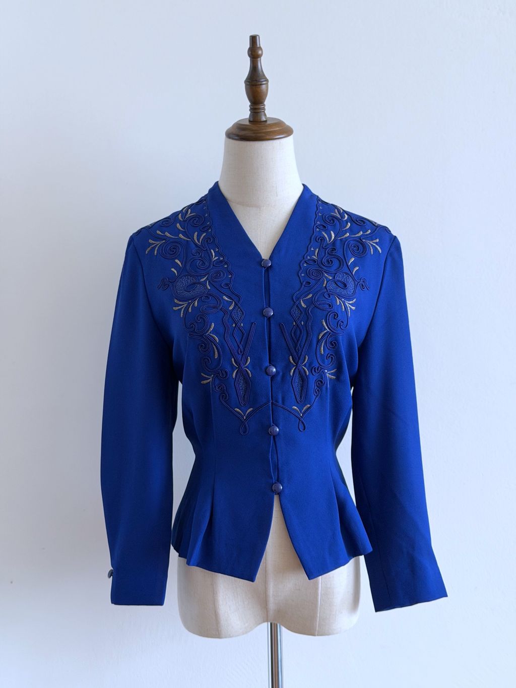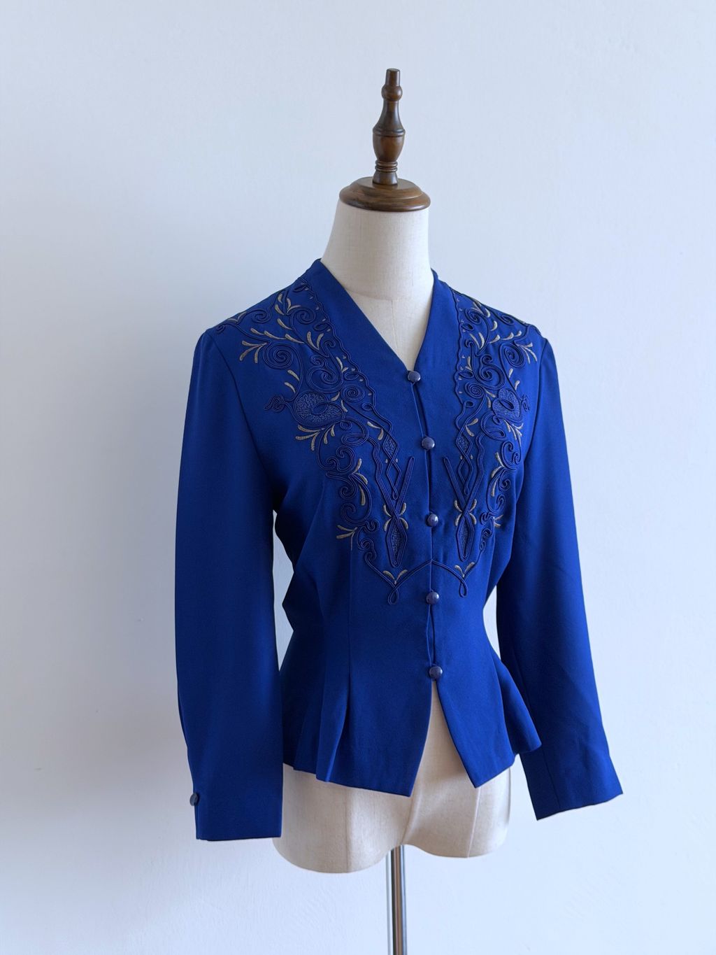A statement piece defined by its rich royal blue hue and ornate swirling embroidery. Crafted in a structured silhouette with a deep V-neckline, this blazer showcases intricate stitchwork that catches the light with subtle dimension. The embroidery adds a sense of craftsmanship and character, reminiscent of vintage tailoring traditions. Fully lined, medium-weight, and refined, an elegant yet striking piece that transitions effortlessly from daywear to evening layering.