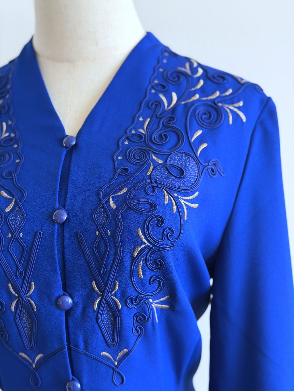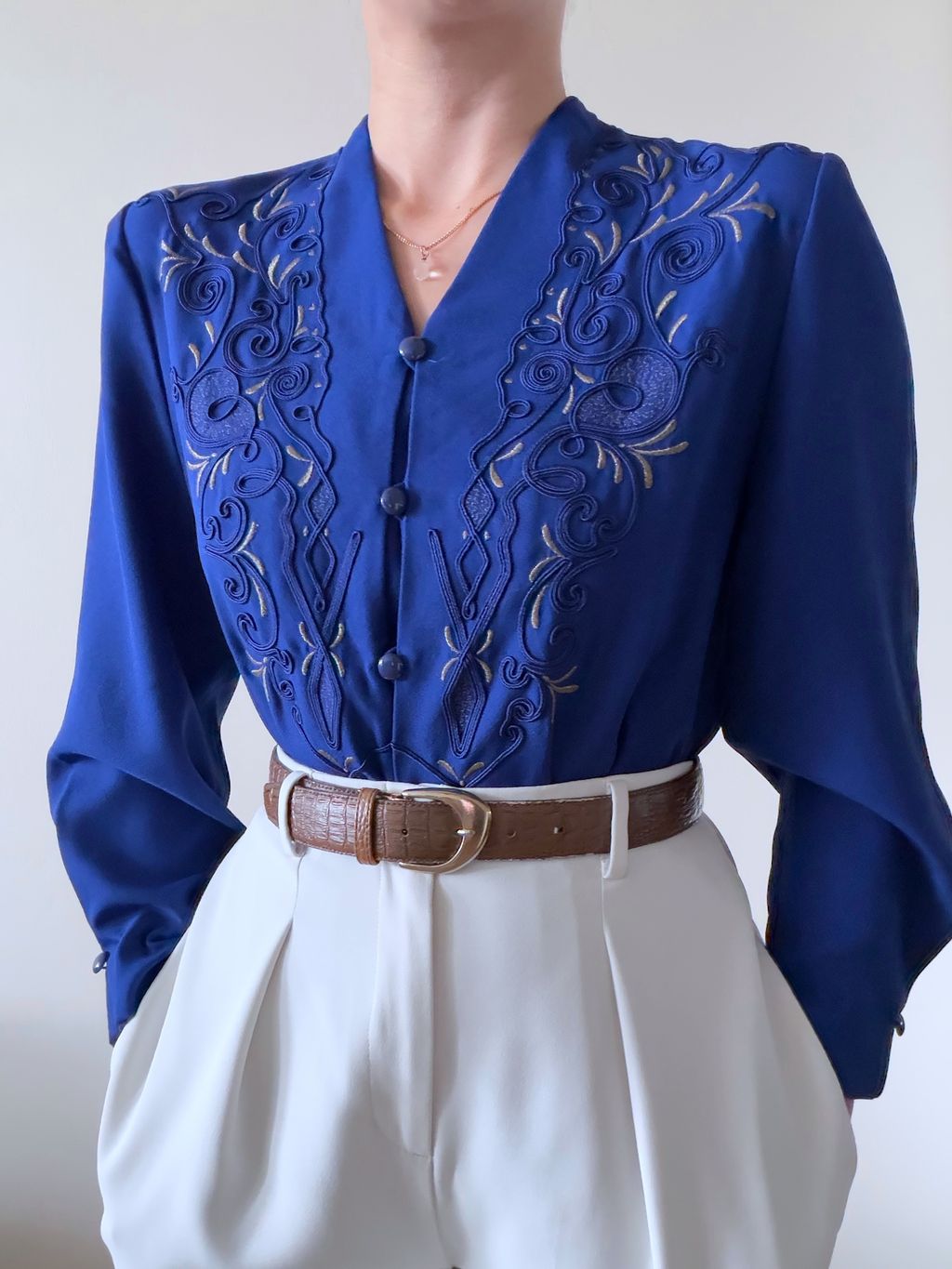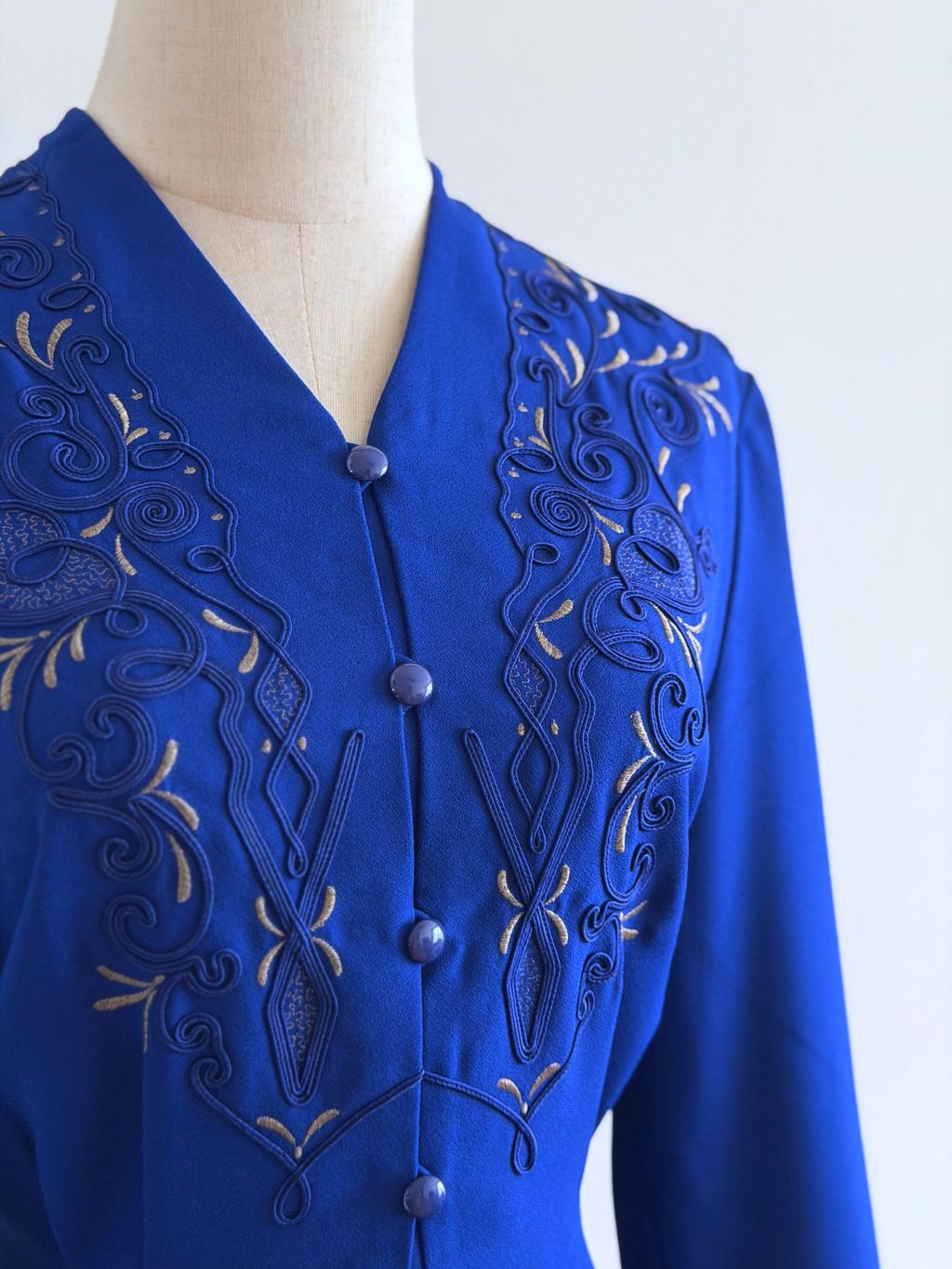 A statement piece defined by its rich royal blue hue and ornate swirling embroidery. Crafted in a structured silhouette with a deep V-neckline, this blazer showcases intricate stitchwork that catches the light with subtle dimension. The embroidery adds a sense of craftsmanship and character, reminiscent of vintage tailoring traditions. Fully lined, medium-weight, and refined, an elegant yet striking piece that transitions effortlessly from daywear to evening layering.
