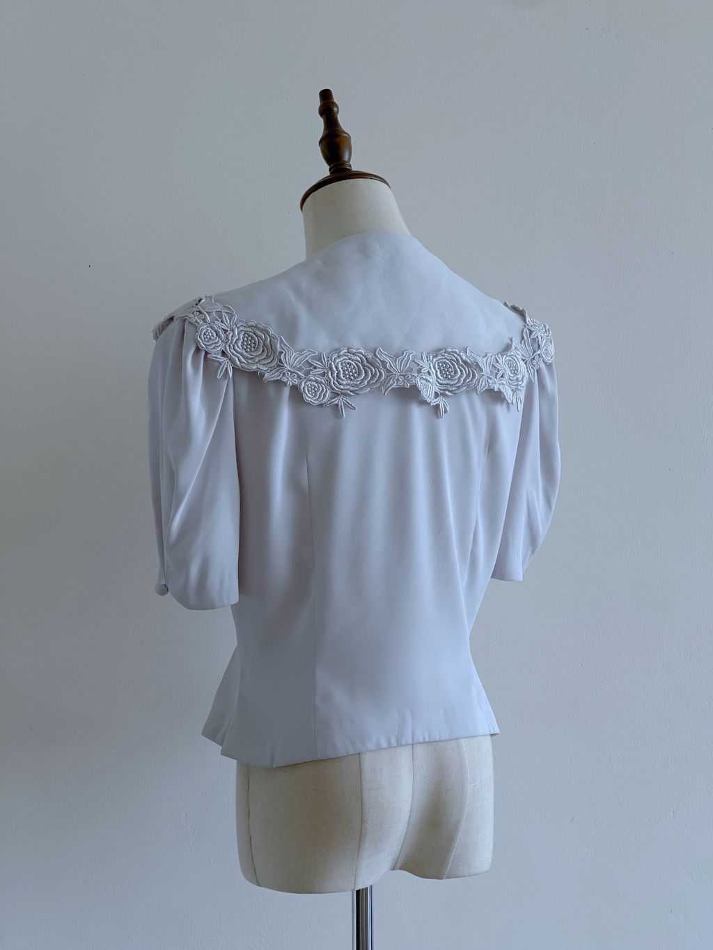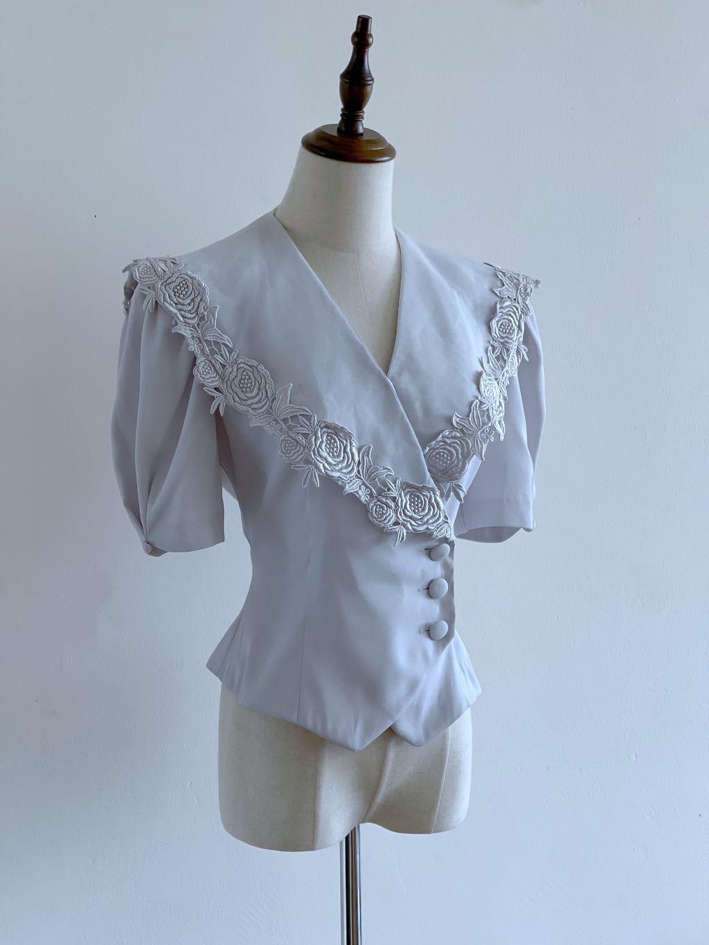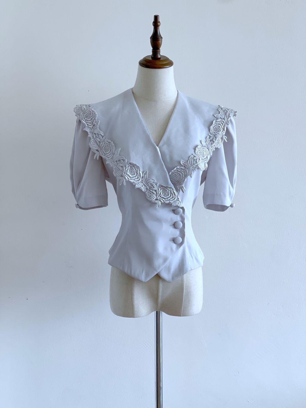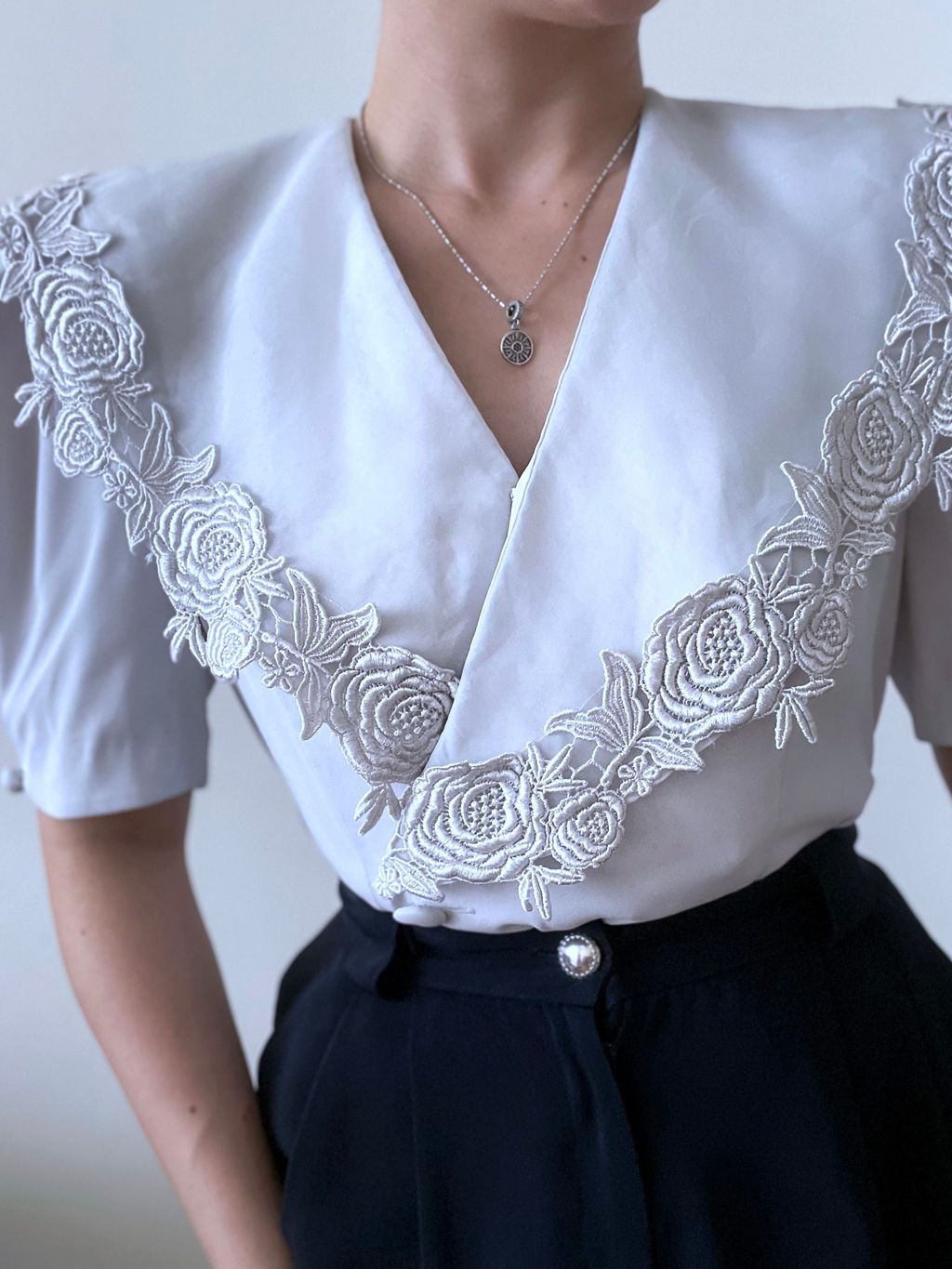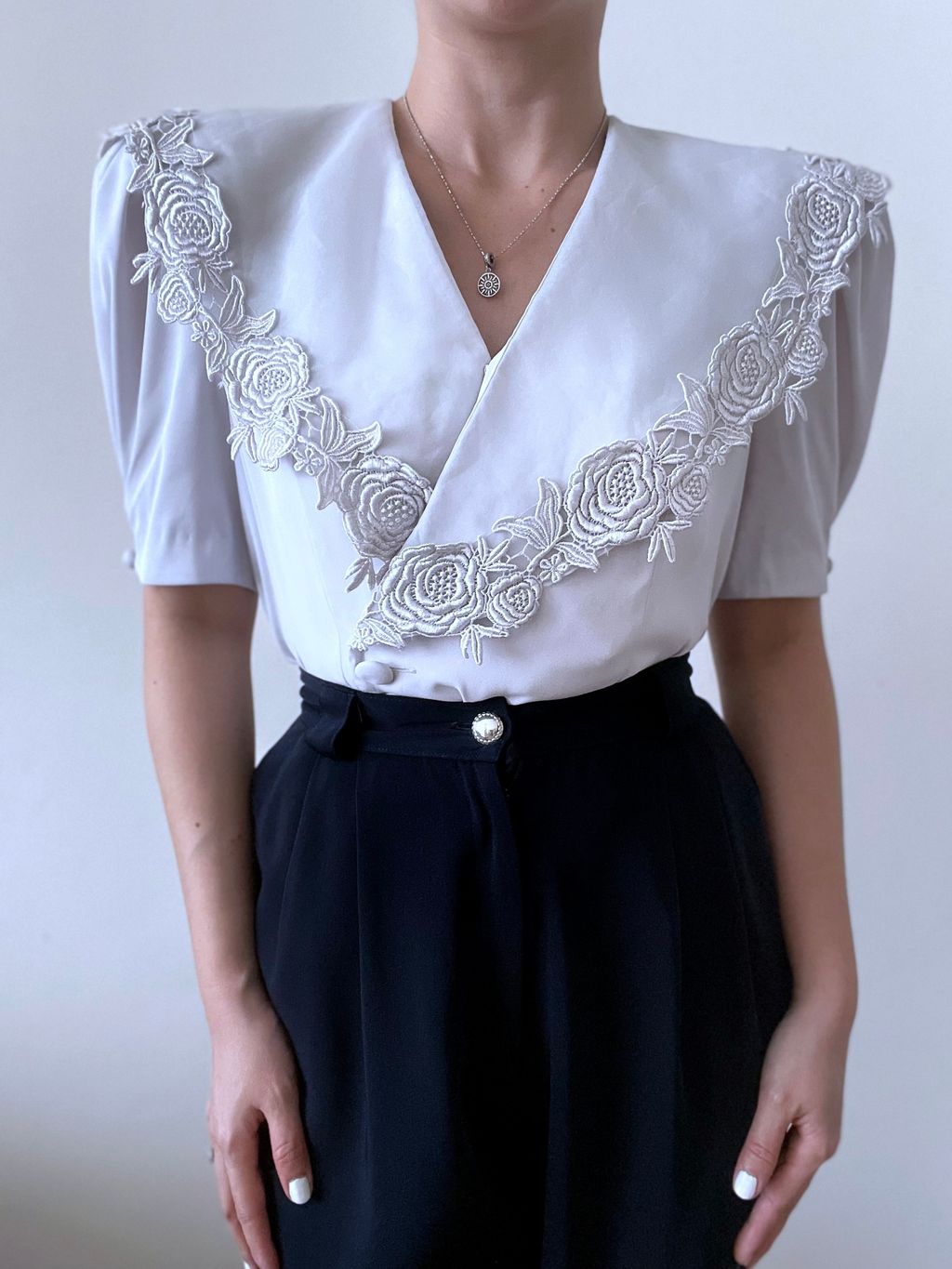 Romantic with a touch of 80s drama, this vintage blouse draws inspiration from Victorian and Edwardian silhouettes. Featuring a wide shawl collar trimmed with intricate floral lace, it balances soft femininity with structured elegance. Short puffed sleeves and a fitted silhouette create a flattering shape, while the button-front closure and subtle shoulder pads offer a poised, tailored finish.