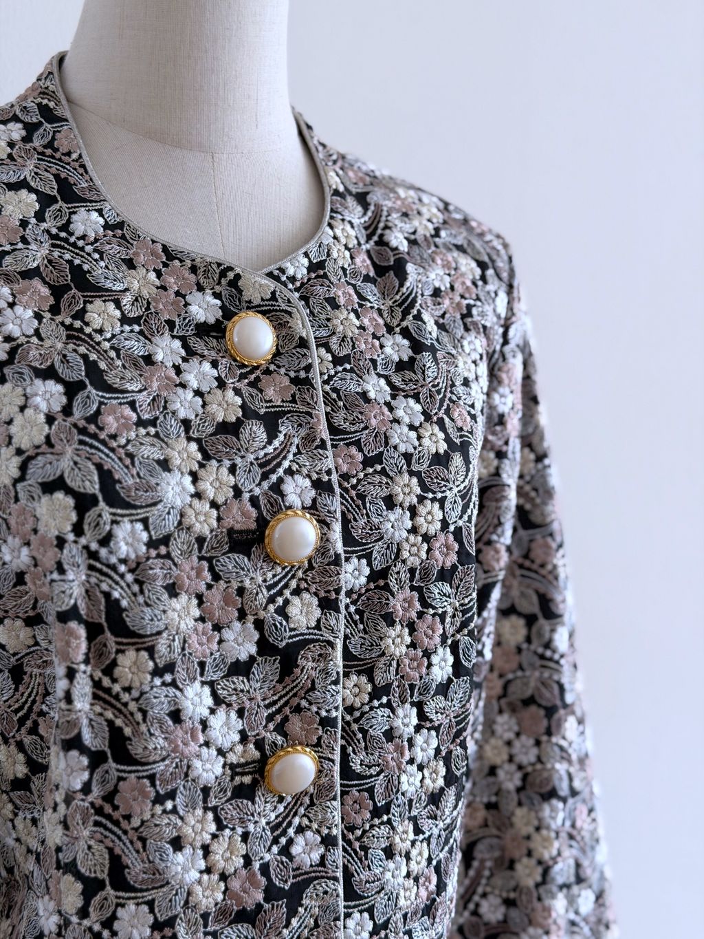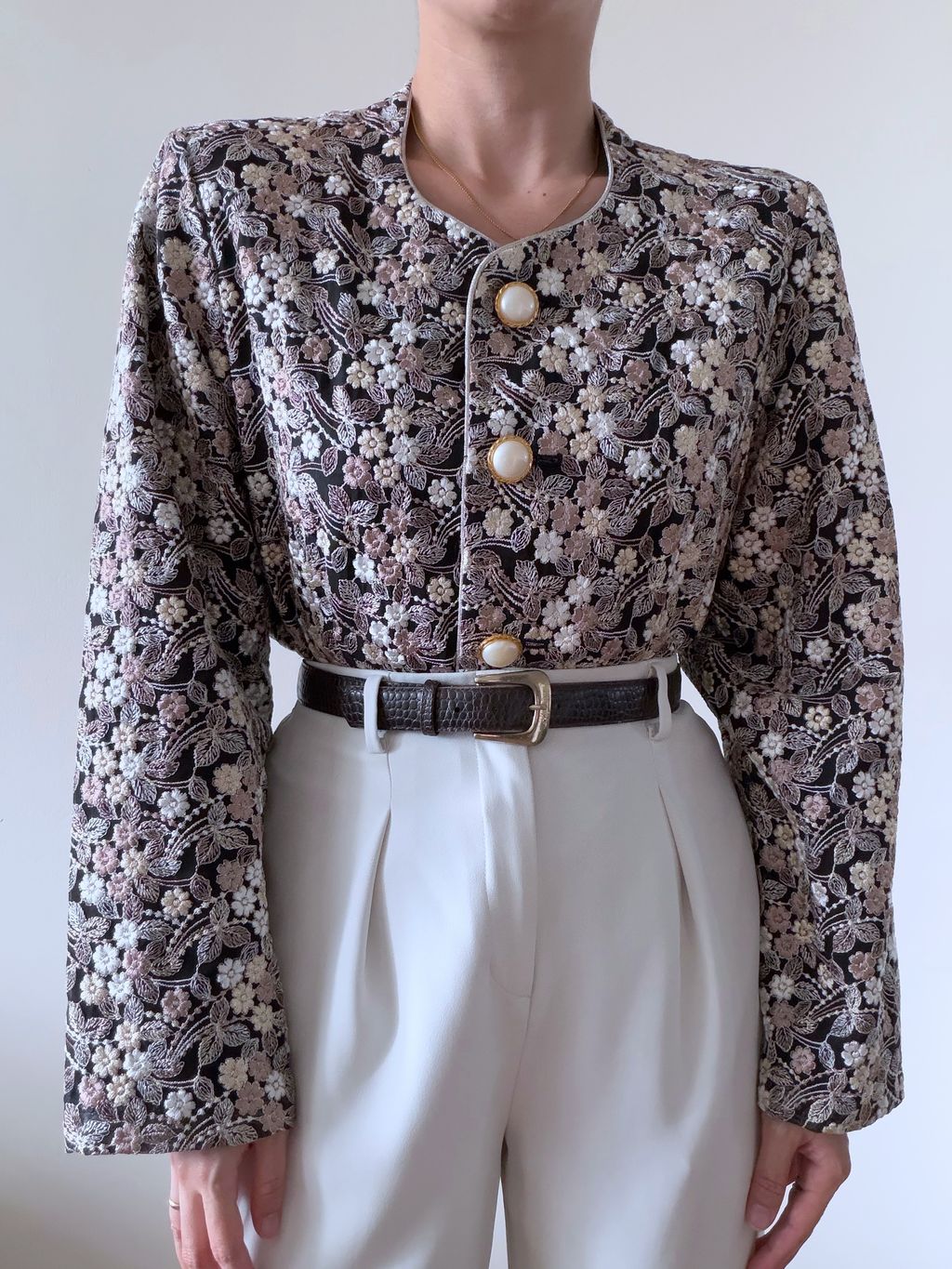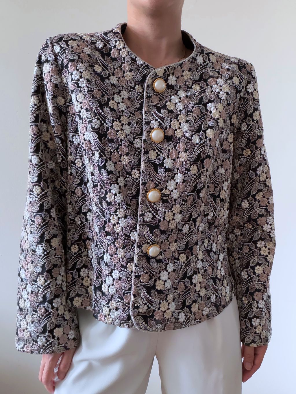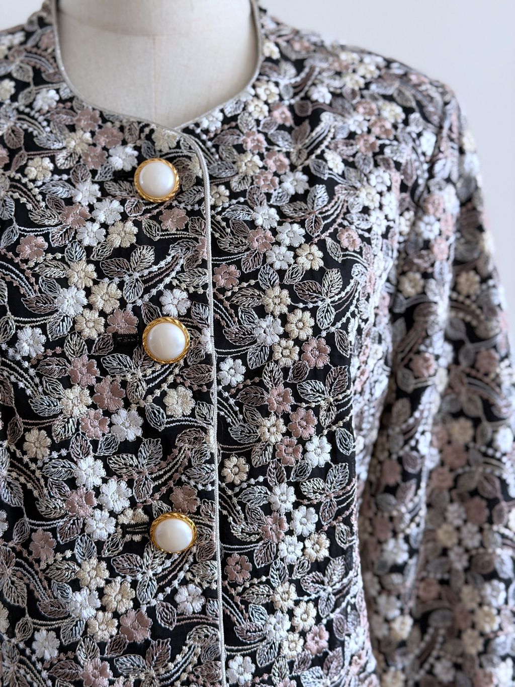 A statement of timeless elegance, this vintage blazer dazzles with richly embroidered florals in shimmering threads, creating a luxurious textured effect. Fully lined and structured with shoulder pads, it fastens with pearl-like buttons for a refined, classic finish. Bold yet sophisticated, it brings vintage glamour to any wardrobe with effortless poise.