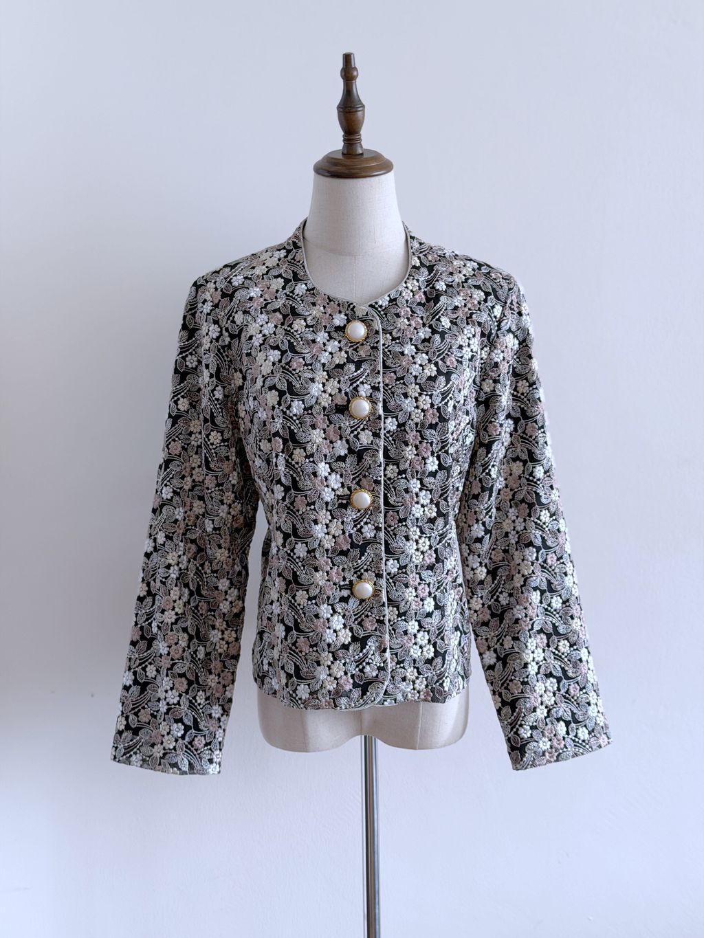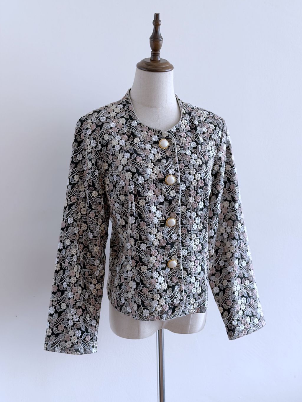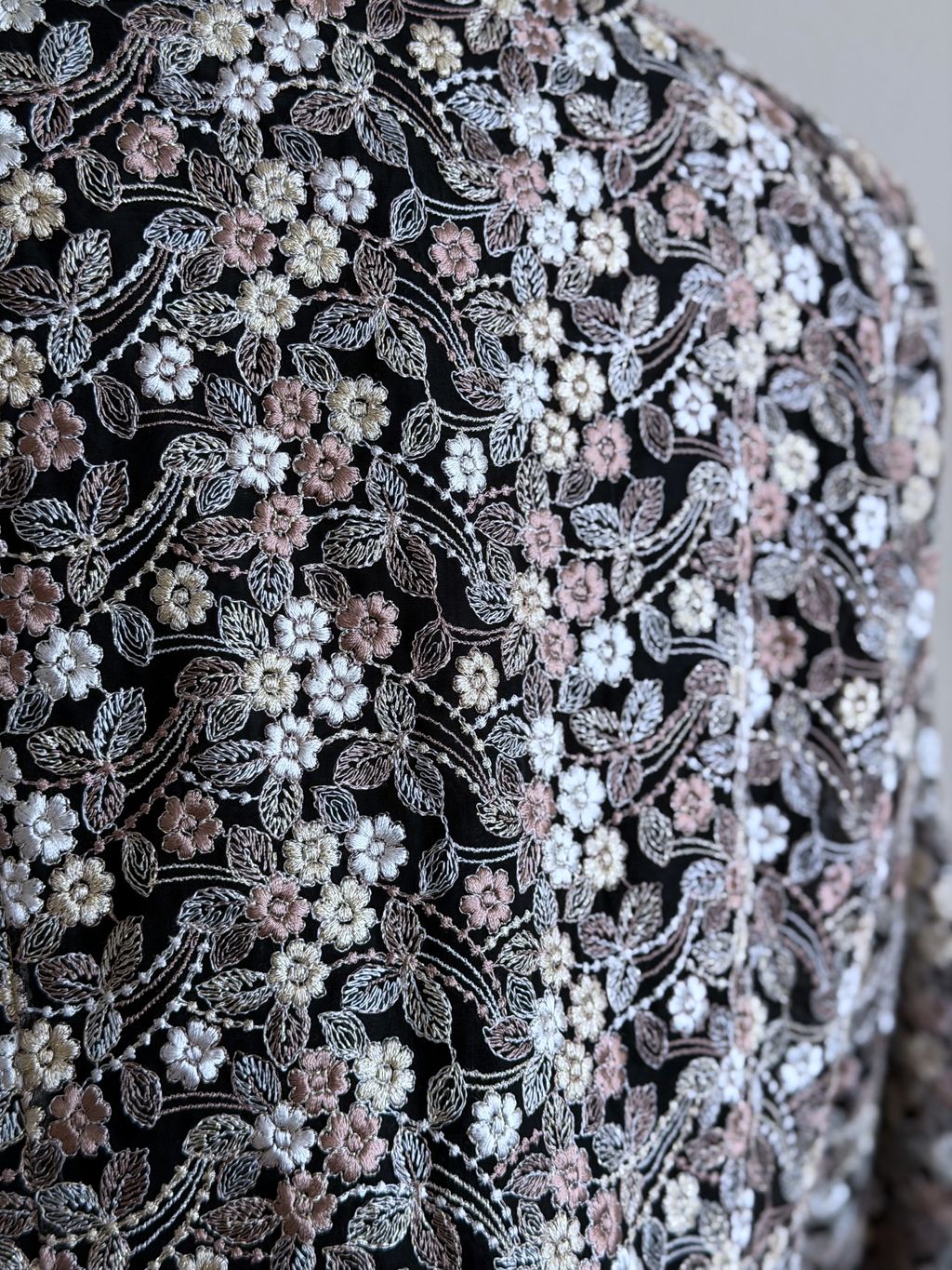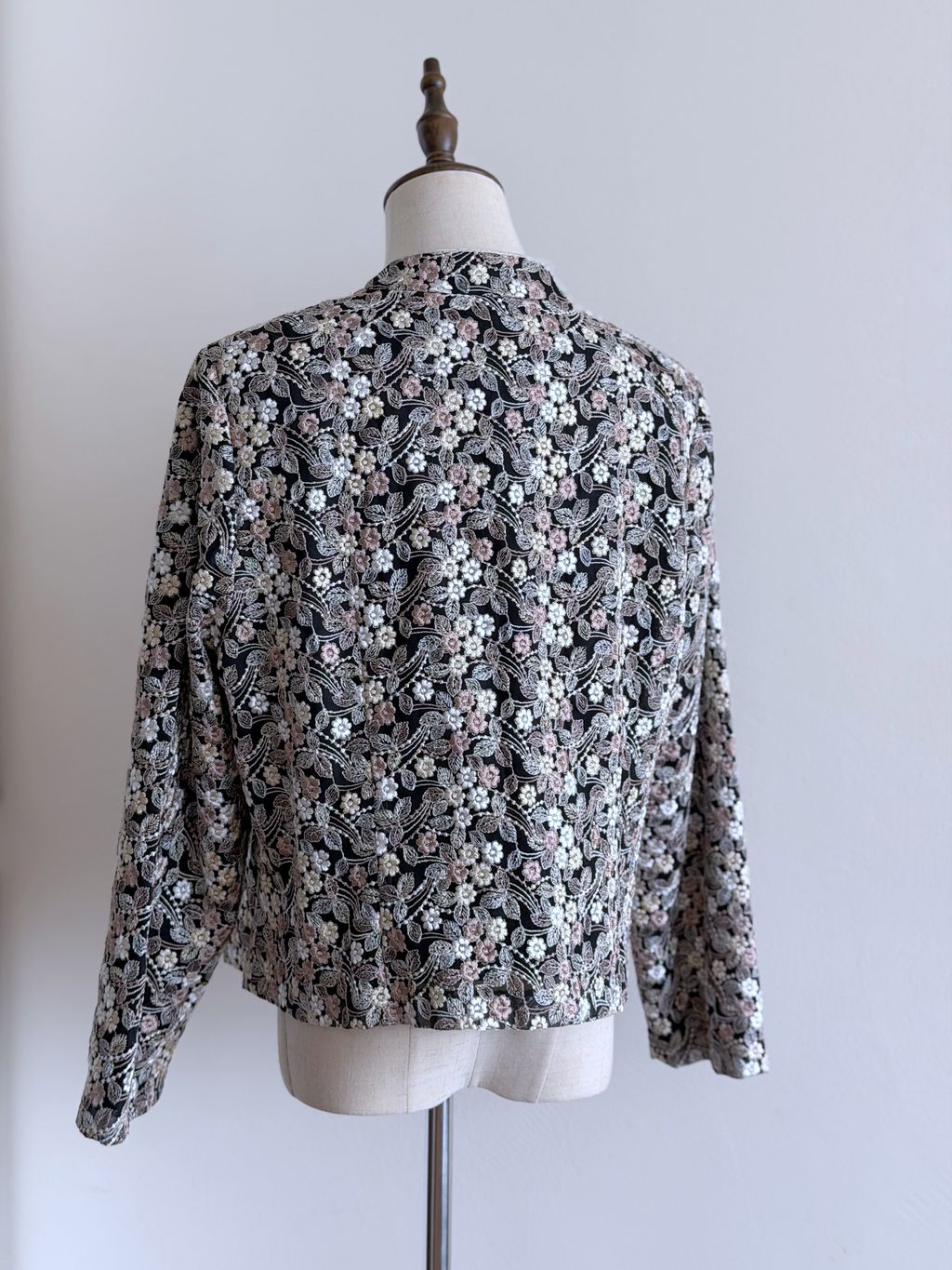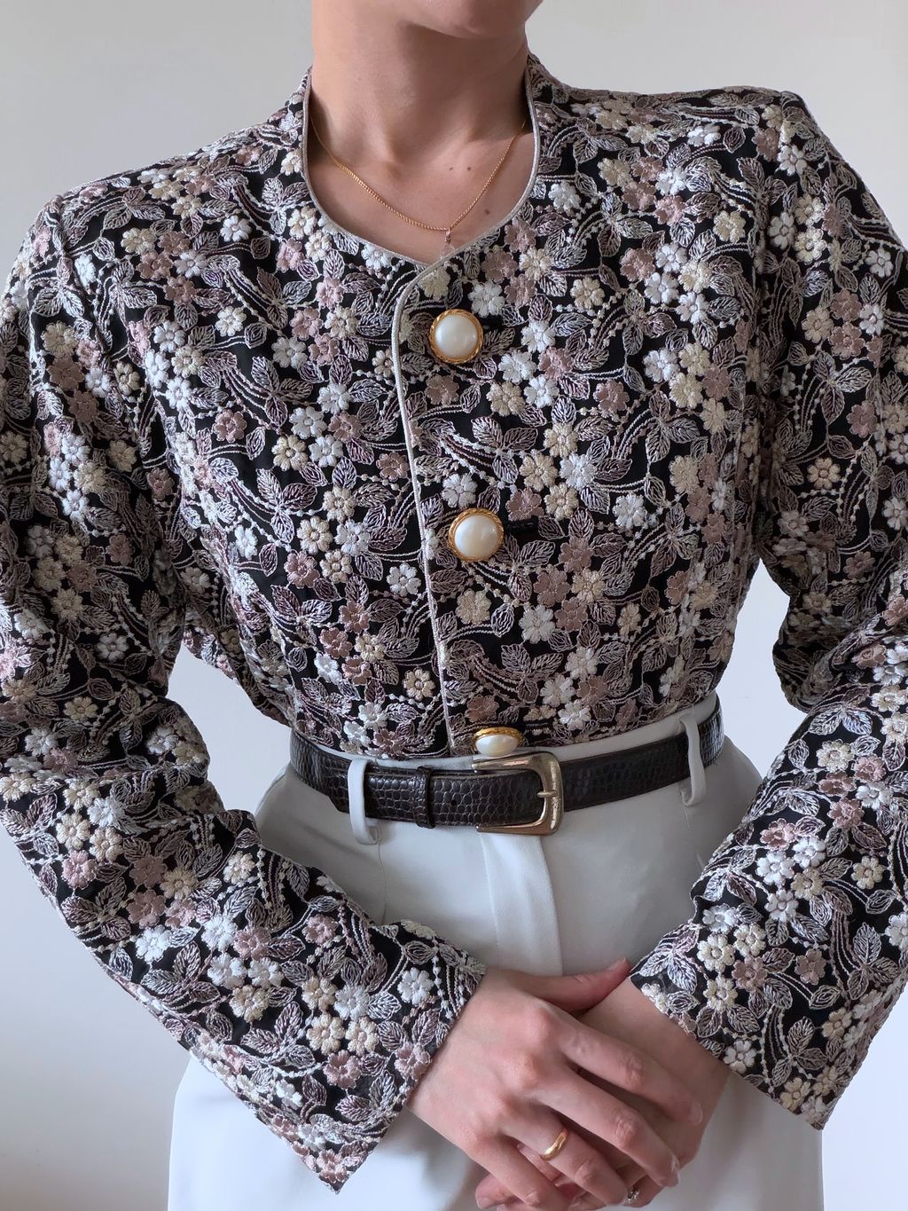 A statement of timeless elegance, this vintage blazer dazzles with richly embroidered florals in shimmering threads, creating a luxurious textured effect. Fully lined and structured with shoulder pads, it fastens with pearl-like buttons for a refined, classic finish. Bold yet sophisticated, it brings vintage glamour to any wardrobe with effortless poise.