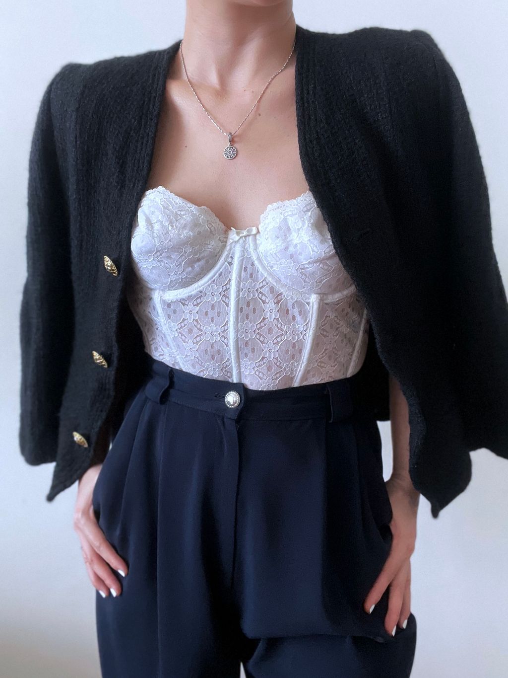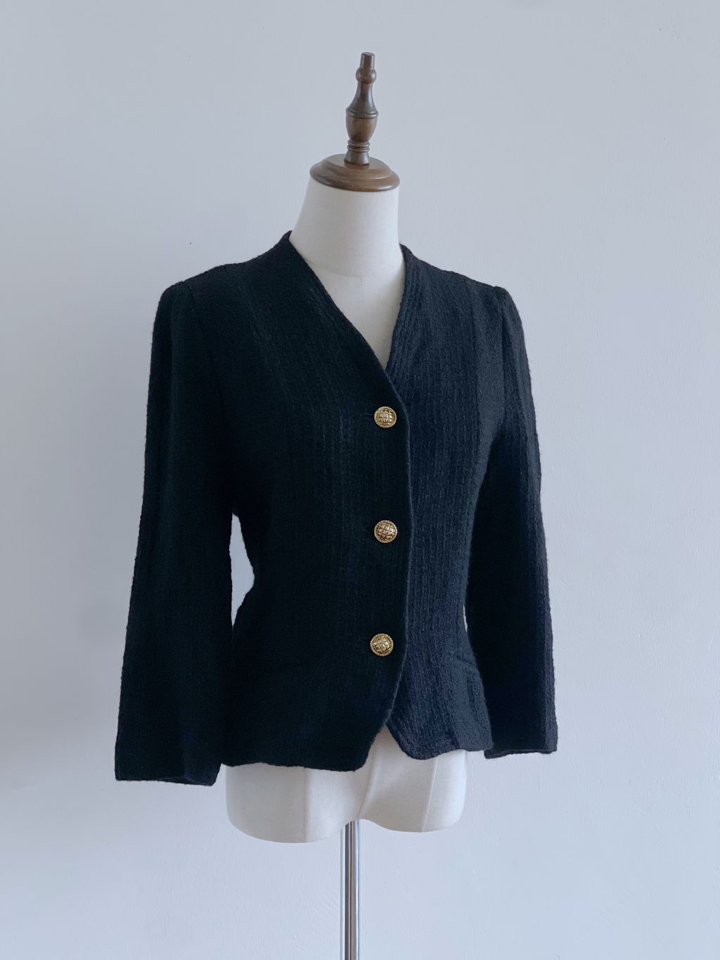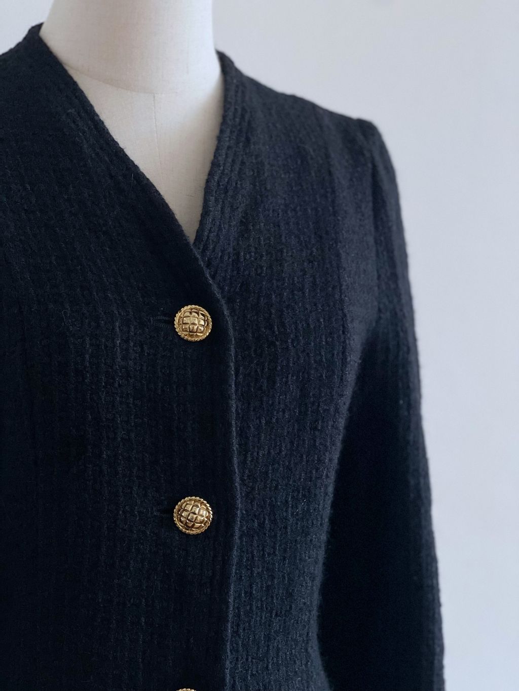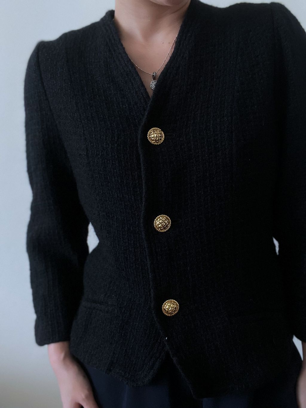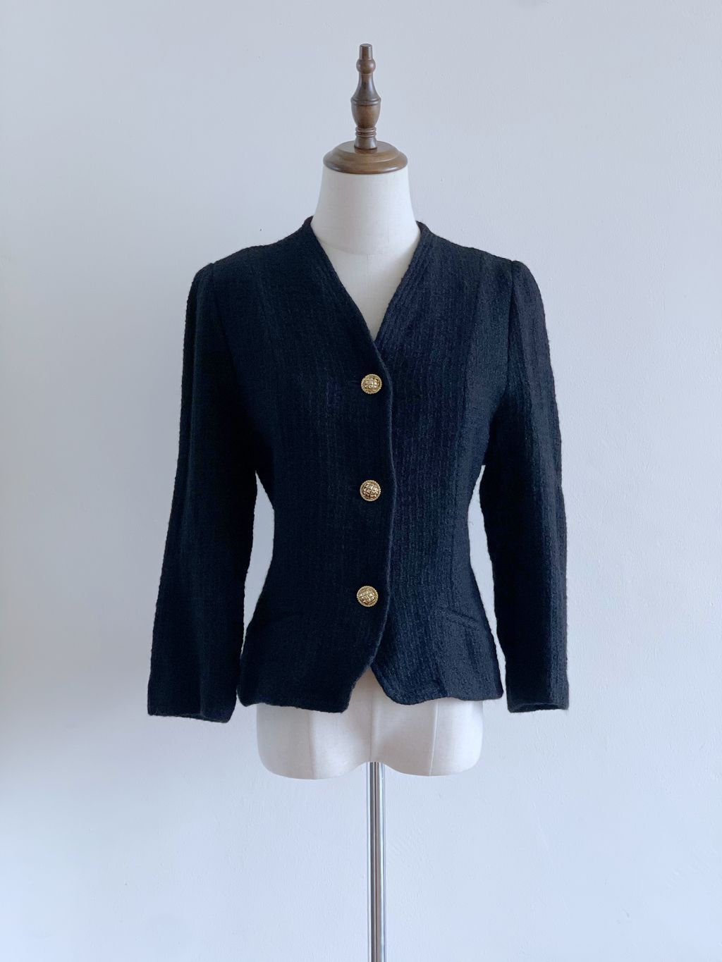 Chic and timeless, this vintage wool tweed blazer features a collarless silhouette that exudes effortless sophistication. The tailored fit is beautifully accented with braided trim, lending texture and structure to the classic design. Finished with two patch pocket, shoulder pads and gleaming gold-tone buttons, this piece blends heritage craftsmanship with modern elegance—a versatile wardrobe staple for polished layering.